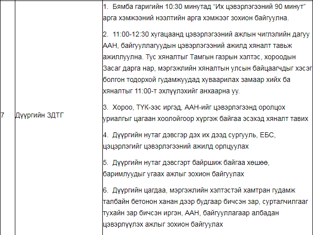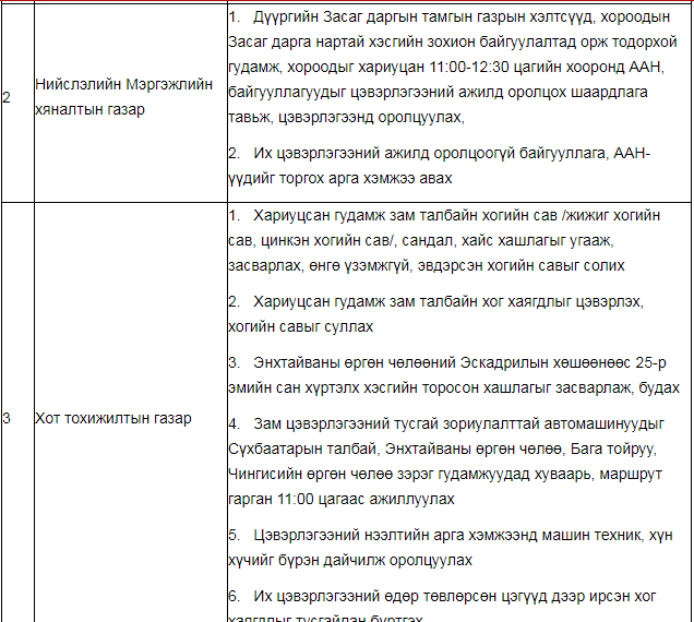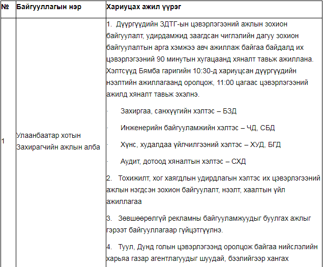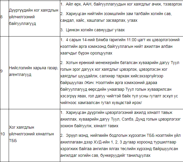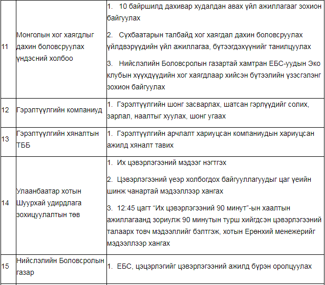 Цэвэрлэгээнд оролцогч байгууллагуудын ажил үүргийн хуваарь: