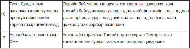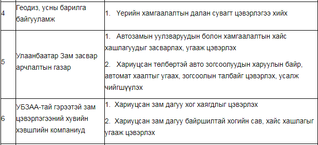 - Гудамж, зам талбай, голын ай сав газар, төмөр замын хамгаалалтын зурвас газрын хог хаягдлыг цэвэрлэх, айл өрх, аж ахуйн нэгж байгууллагуудын хог хаягдлын ачилт, тээвэрлэлтийг эрчимжүүлэх