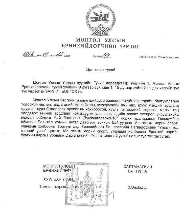 Монгол Улсын Засгийн газрын шийдвэр зөвшөөрөлгүйгээр, төрийн байгууллагын тодорхой чиглэл, мэдэгдлийг үл хайхарч, хүүхдүүдийн амь нас, эрүүл мэндийг эрсдэлд оруулан сурч боловсрох эрхийг нь хохироосон, хууль тогтоомж зөрчсөн, малын гоц халдварт өвчний эрсдлийг нэмэгдүүлж улс орны эдийн засагт хохирол учруулахуйц нөхцөл байдлыг бий болгосон “Дүнжингарав-2018” морин уралдааныг Говьсүмбэр аймгийн Баянтал сумын нутаг дэвсгэрт зохион байгуулсан Монголын морин спорт, уяачдын холбооны Тэргүүн дэд Ерөнхийлөгч Дашзэвэгийн Дагвадоржийн “Улсын тод манлай уяач” цолыг, Монголын морин спорт, уяачдын холбооны Ерөнхий нарийн бичгийн дарга Пүрэвийн Сэргэлэнгийн “Улсын манлай уяач” цолыг тус тус хассугай” гэжээ.