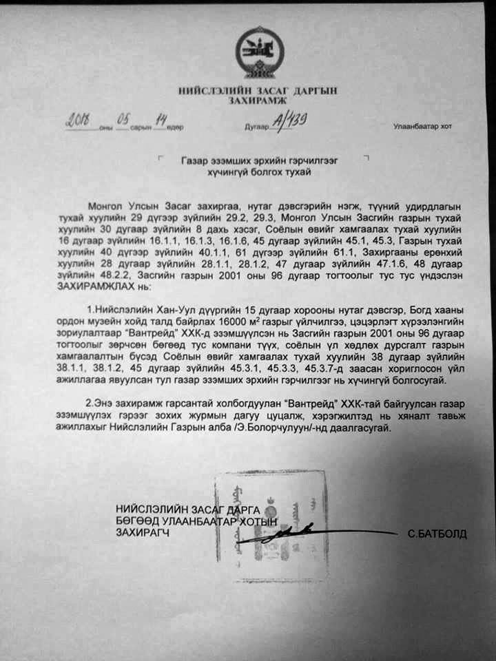 Нийслэлийн Засаг дарга бөгөөд Улаанбаатар хотын Захирагч С.Батболд өчигдөр “Ван трейд” ХХК-ийн газар эзэмших эрхийн гэрчилгээг хүчингүй болгох захирамж гаргалаа.
