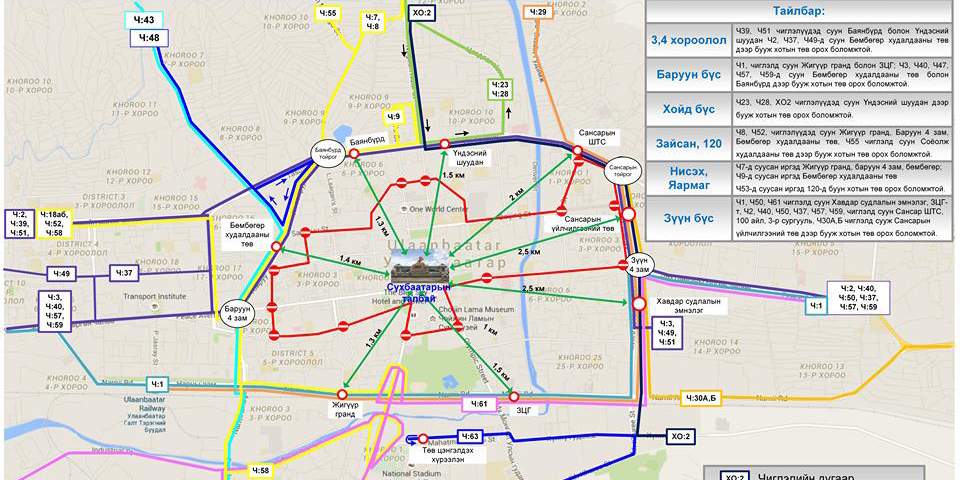 Тодруулбал, Их тойруугаар явах чиглэлүүдэд Баянбүрд, Үндэсний шуудан, Сансарын ШТС зогсоолуудаас, Нарны замаар явах чиглэлүүдэд Жигүүр гранд, Замын цагдаагийн газар, Миний дэлгүүр зогсоолуудаас, Босоо чиглэл буюу хойноос урагш явах чиглэлүүдэд Ногоон нуур, 120 мянгат, Төв цэнгэлдэх хүрээлэн зогсоолуудаас, Баруун 4 замыг дайран өнгөрөх чиглэлүүдэд МҮЭСТО, Элба төв, Бөмбөгөр худалдааны төв, Нарны титэмийн зогсоолуудаас, Зүүн 4 замыг дайран өнгөрөх чиглэлүүдэд Сансарын үйлчилгээний төв, Хадвар судлалын эмнэлэг зогсоолуудаар сууж үйлчлүүлэх боломжтой аж. Харин хотын төвийн буюу Их тойруу доторх гол гудамж, замууд хаагдах үед нийтийн зорчигч тээврийн үйлчилгээний чиглэлүүд хойгуураа Их тойруугийн гудамж, урдуур Нарны зам, Намъяанжугийн гудамжаар явах бөгөөд хойноос урагш болон урдаас хойш явдаг босоо чиглэлүүд Баруун 4 зам, Нарны гүүр, Зүүн 4 замаар үйлчилж 17:00 цагаас хойш үндсэн замналаар үйлчилгээ үзүүлэх юм байна.