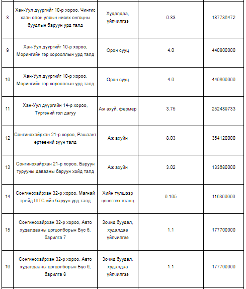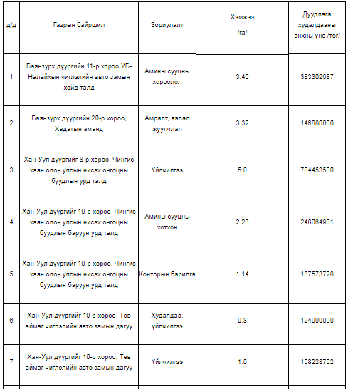 Дэлгэрэнгүй мэдээллийг www.ulaanbaatar.mn, www.gazar.ub.gov.mn хаягаар болон 315712 утсаар авах боломжтой гэж нийслэлийн Газрын албанаас мэдээллээ.