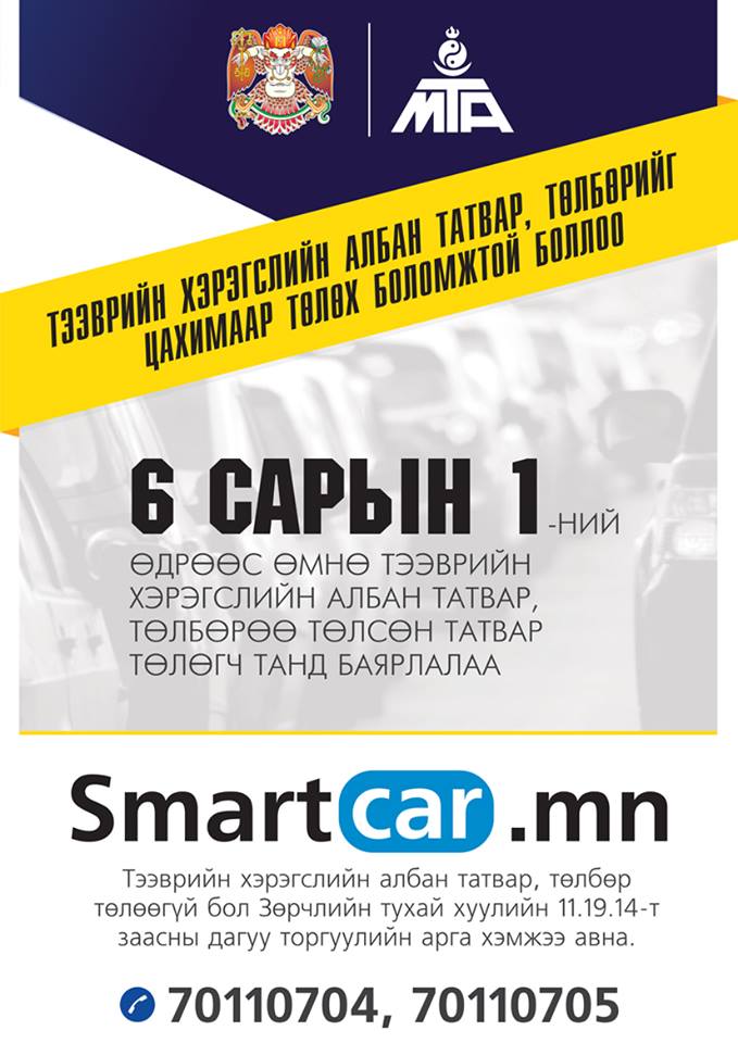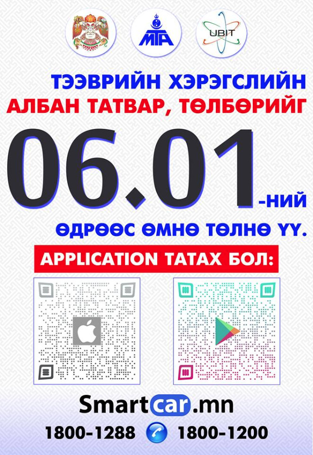 Тээврийн хэрэгслийн албан татвар, төлбөр төлөхөд ердөө гурван минут л хангалттай боллоо. Тээврийн хэрэгсэл эзэмшигч та тээврийн хэрэгслийн нэгдсэн цахим үйлчилгээний /www.smartcar.mn/ цахим хуудасаар нэвтэрч, QPay үйлчилгээг ашиглан төлөх боломжтой болсон. Албан татвар, төлбөрийг онлайнаар хэрхэн төлөх тухай зааврыг доорхи видеоноос харна уу.