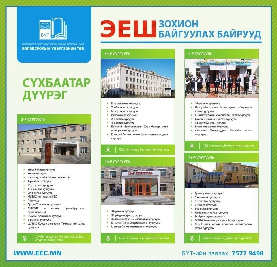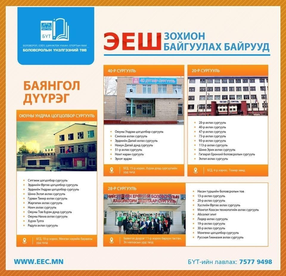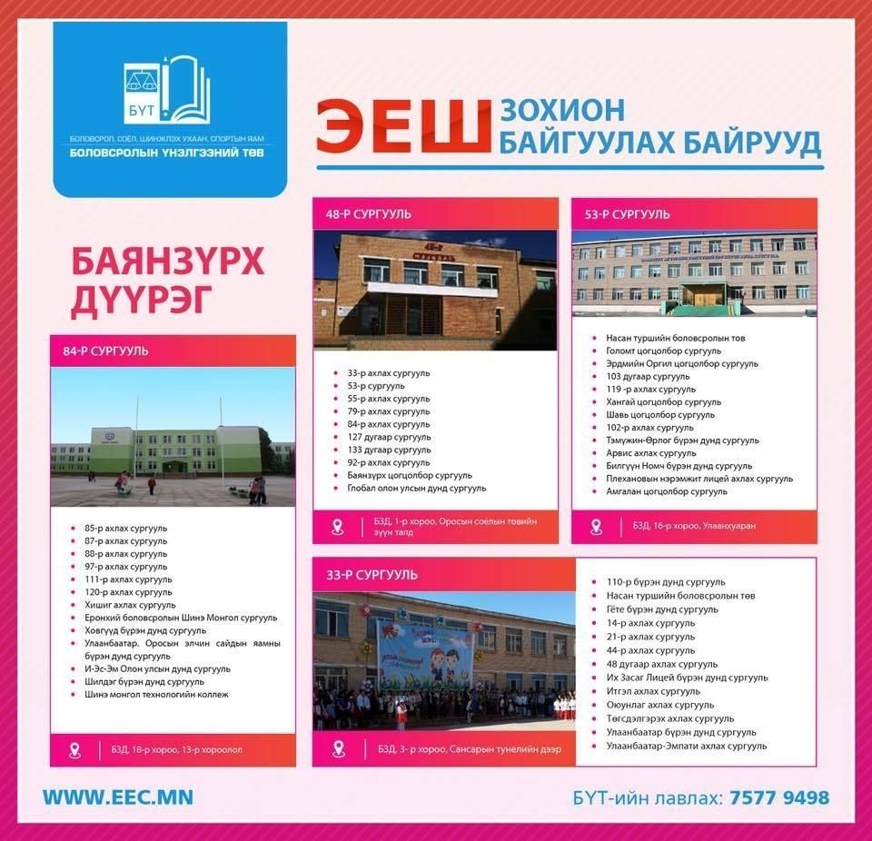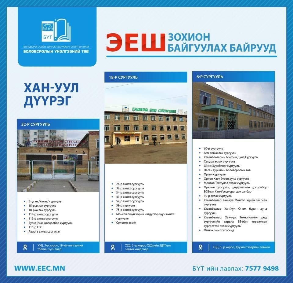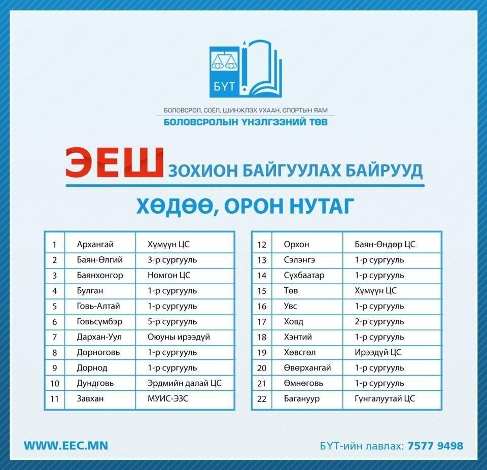 Та бүхэнд ЭЕШ зохион байгуулах байруудын байршлыг хөдөө орон нутаг болон дүүргээр танилцуулж байна.