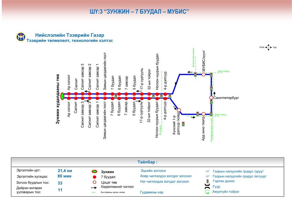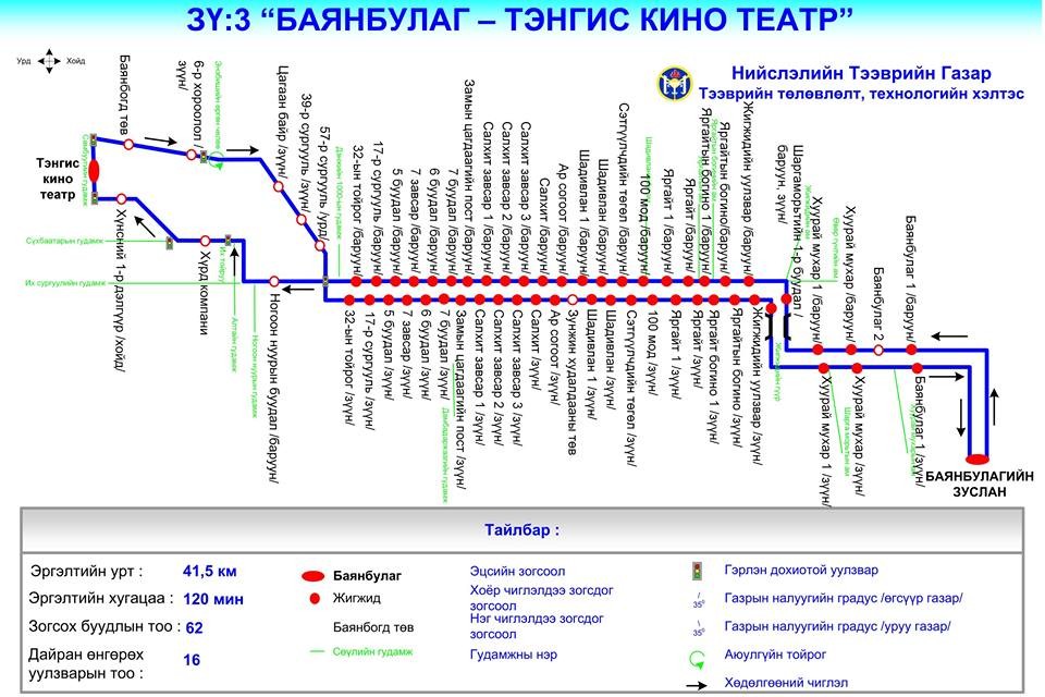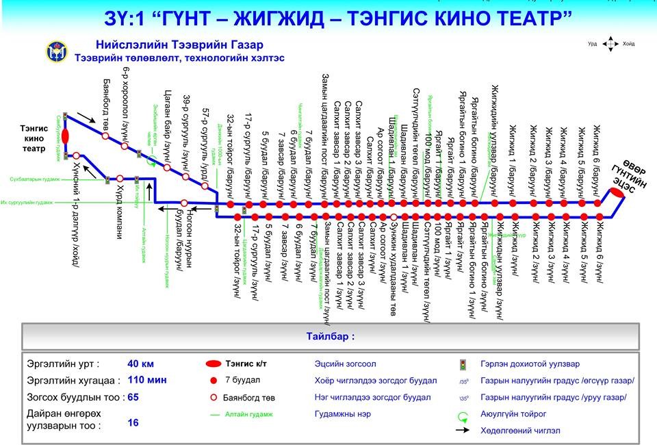 ЗҮ:1 “Гүнт-Жигжид-Тэнгис кино театр” чиглэлд их багтаамжийн 3 автобус 35 минут тутамд Тэнгис кино театрын зогсоолоос;