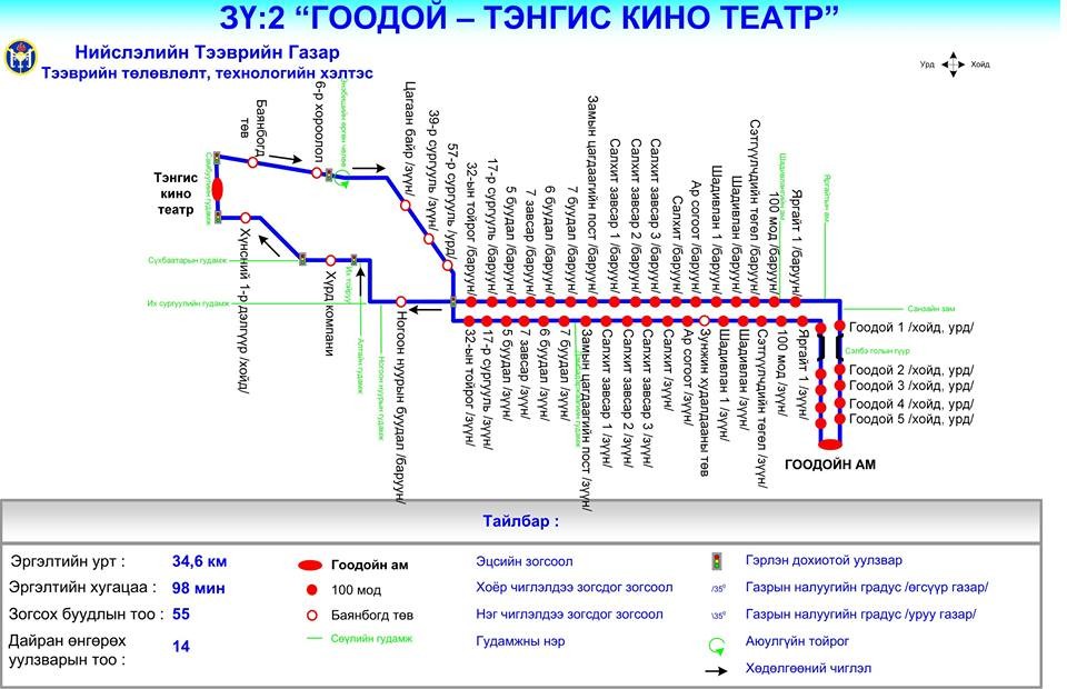 ЗҮ:2 “Гоодой-Тэнгис кино театр” чиглэлд 1 их багтаамжийн автобус 1:30 цаг тутамд Тэнгис кино театрын зогсоолоос;