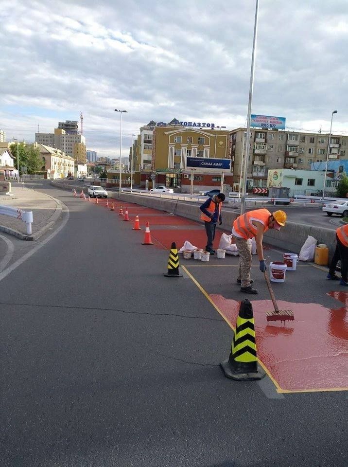 Нийслэлийн зарим уулзварын авто замд халтиргаанаас хамгаалах өнгөт хучилтыг хийж эхэлжээ.