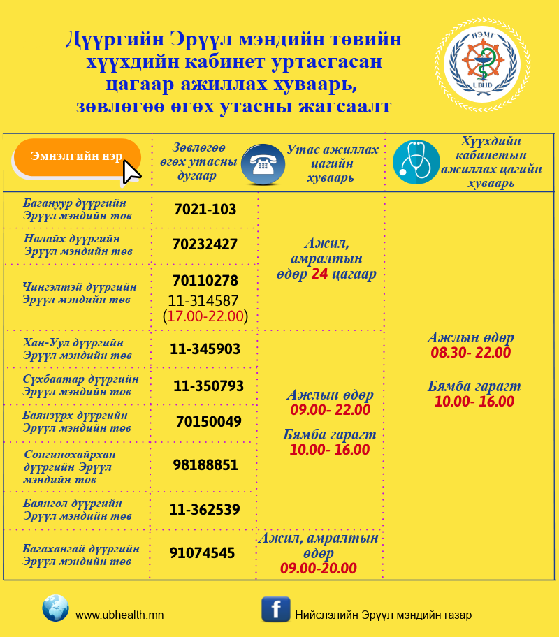 Түүнчлэн эцэг, эхчүүд бага насны хүүхдээ ханиад томуунаас урьдчилан сэргийлэх, гэрийн нөхцөлд хэрхэн асарч сувилах, өвчний шинж тэмдгийг хэдийд таньж мэдэх, тохирох эм бэлдмэлийг ямар байдлаар сонгож хэрэглэх, эмнэлгийн яаралтай тусламжийг ямар үед авах вэ гэх мэт олон талын зөвлөгөөг мэргэжлийн эмчээс утсаар асууж лавлах бүрэн боломжтой юм.