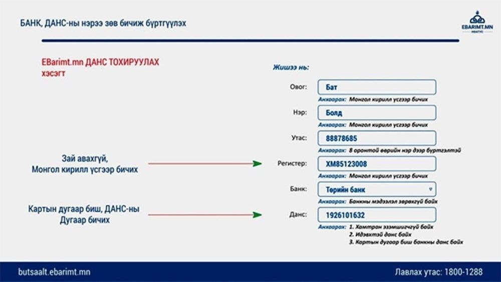 EBARIMT.MN - ХУВЬ ХҮН/ НЭВТРЭХ ДАНС - ТОХИРУУЛАХ гэсэн дарааллаар орж, доорх байдлаар мэдээллээ үнэн зөв болгоно уу. Үүнд: