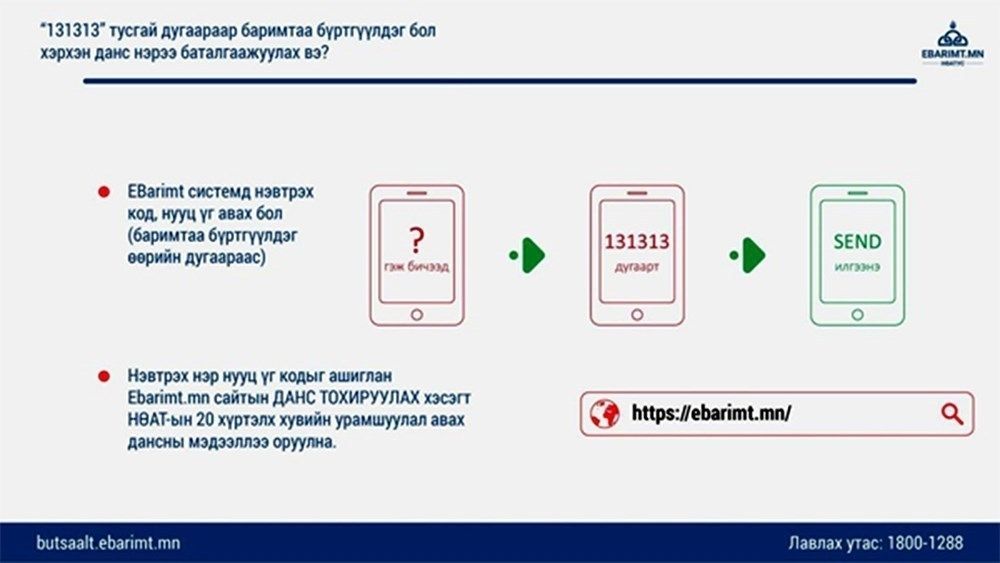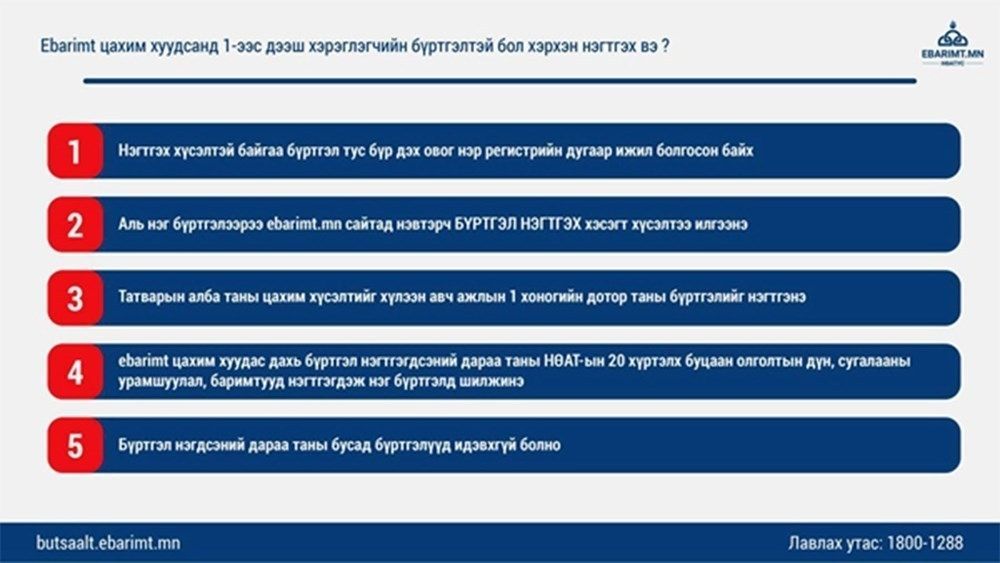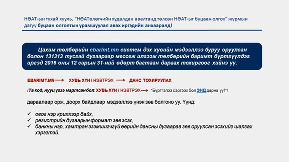 Иргэн та 2017 онд бүртгүүлсэн баримтын буцаан олголтыг аваагүй, эсвэл 2018 онд бүртгүүлсэн баримтын сугалааны хонжвор дансанд тань орж ирээгүй бол 2018 оны 12 дугаар сарын 15-ны өдрөөс өмнө харьяа татварын албанд очиж, мэдээллээ шинэчлүүлэх, е-баримтын системд нэвтэрч мэдээллээ баталгаажуулах эс бөгөөс 1800-1288 дугаарт залгаж, бүртгэлийн мэдээллээ залруулахыг сануулж байна.