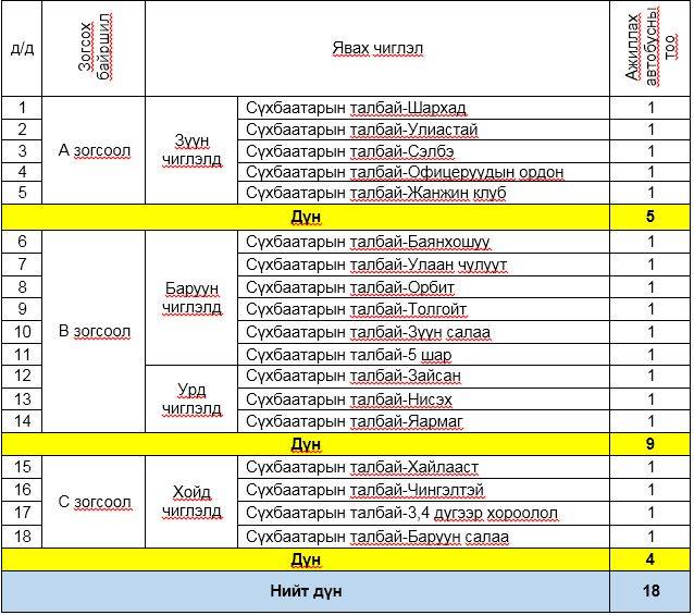 “Шинэ жилийн баярын цэнгүүн” нэгдсэн үйл ажиллагаа өндөрлөхөд их багтаамжийн автобусны 18 чиглэлд 18 автобус Сүхбаатарын талбайн баруун, зүүн болон урд зогсоол буюу зурагт тэмдэглэсэн “А”, “B”, “С” зогсоолоос суурьшлын цэгүүд рүү үнэ төлбөргүй үйлчлэр юм.