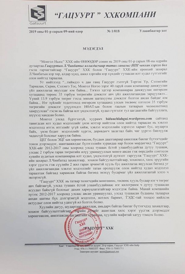 Мэдэгдэлдээ “Монгол Ньюс” ХХК-ний ӨНӨӨДӨР сонин нь 2019 оны 1-р сарын 08-ны өдрийн дугаартаа Гацууртын Л.Чинбатыг яллагдагчаар татах саналыг НПГ-ынхан хэрхэх болон гэсэн г арчигтайгаар “Гацуурт” ХХК-ний болон “Гацуурт” ХХК-ний ерөнхий захирал Л.Чинбатын нэр төр, алдар хүнд, ажил хэргийн нэр хүндийг гутаасан илт худал гүтгэлгийг олон нийтэд тараалаа." хэмээжээ.