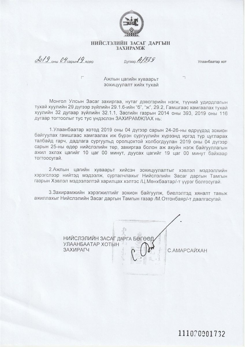 Захирамжид 2019 оны дөрөвдүгээр сарын 25-ны өдөр Нийслэлийн төр, захиргаа болон аж ахуйн нэгж байгууллагын ажил эхлэх цагийг 10:00, дуусах цагийг 19:00 байхаар тусгасан байна.