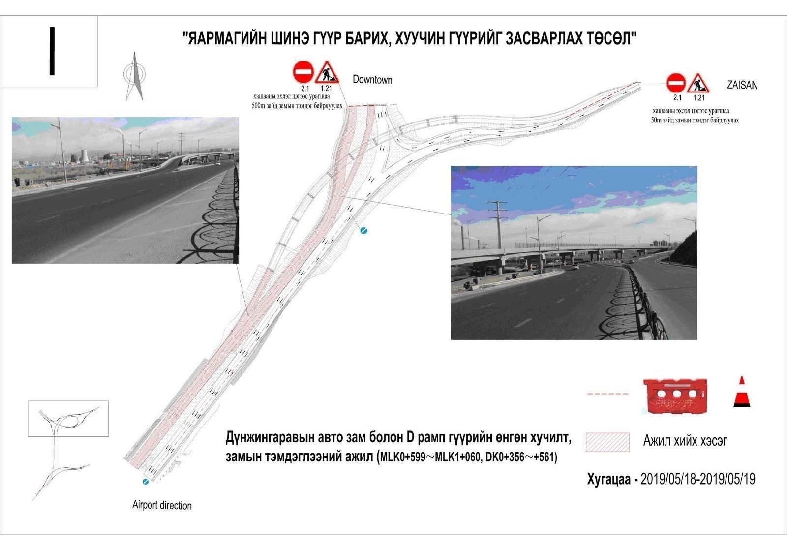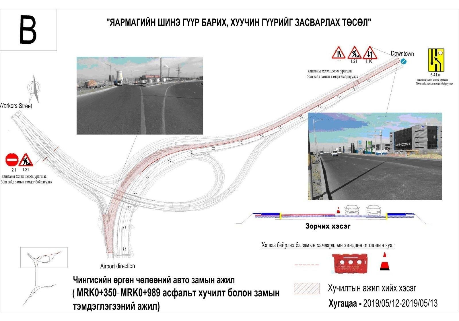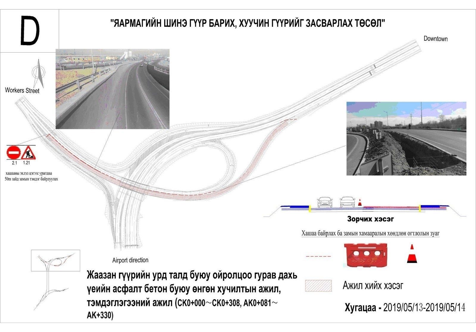 Харин авто замын өнгөн хучилтын ажлыг 5 дугаар сарын 11-ний өдрөөс эхлүүлнэ. Авто замын өнгөн хучилтын ажил 5 дугаар сарын 23-ны өдрийг хүртэл үргэлжилнэ. Иймд тус гүүрний чиглэлүүдийг хуваарийн дагуу хэсэгчлэн хаахаар болжээ. Замыг хэсэгчлэн хааснаар замын хөдөлгөөнд саад учрахгүй ч ачаалал нэмэгдэх тул тус чиглэлд зорчигчдод хэсэгчлэн хаах хуваарийг танилцуулж байна.