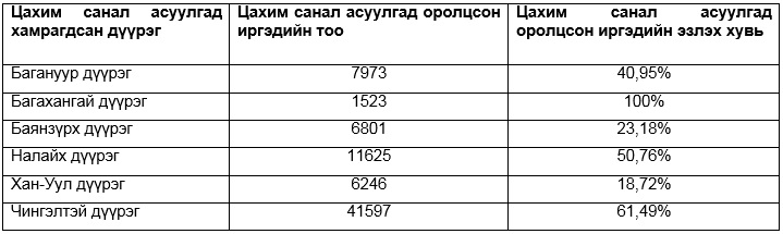 Цахим санал асуулгад хамрагдсан 6 дүүргийн оролцоог ангилан авч үзвэл: