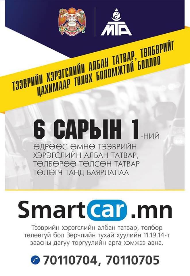 Нийслэлийн Засаг даргын 2018 оны нэгдүгээр сарын 04-ний өдрийн А/02 тоот захирамжийн дагуу Авто тээврийн болон өөрөө явагч хэрэгслийн албан татвар, Агаар бохирдлын төлбөр, Авто зам ашигласны төлбөр хураах ажлыг зохион байгуулж эхэллээ. Нийслэлийн Иргэдийн Төлөөлөгчдийн Хурлын Тэргүүлэгчдийн 2015 оны 28 дугаар тогтоолоор батлагдсан “Нийслэлд авто тээврийн хэрэгслийн бүртгэл, төлбөрийн тогтолцоог шинэчлэн нэвтрүүлэх журам”-ын дагуу тээврийн хэрэгслийн албан татвар, төлбөрийг улсын дугаарын сүүлийн тооноос хамаарч, тогтоосон хугацаанд төлнө.