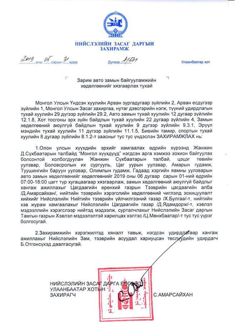 Нийслэлийн Засаг даргын захирамжаар Улаанбаатар хотын төв хэсгийн авто замын хөдөлгөөнийг зарим газарт түр хязгаарлахаар болсон байна. Захирамжид зааснаар Д.Сүхбаатарын талбайд “Монгол хүүхдүүд” нэгдсэн арга хэмжээ зохион байгуулах болсонтой холбогдуулж Д.Сүхбаатарын талбай, Цэцэг төвийн уулзвар, Боловсролын их сургууль, Цаг уурын уулзвар, Амарын гудамж, Туушингийн баруун уулзвар, Олимпийн гудамж, Гадаад хэргийн яамны уулзварын авто замын хөдөлгөөнийг түр хязгаарлахаар шийдвэрлэсэн байна.