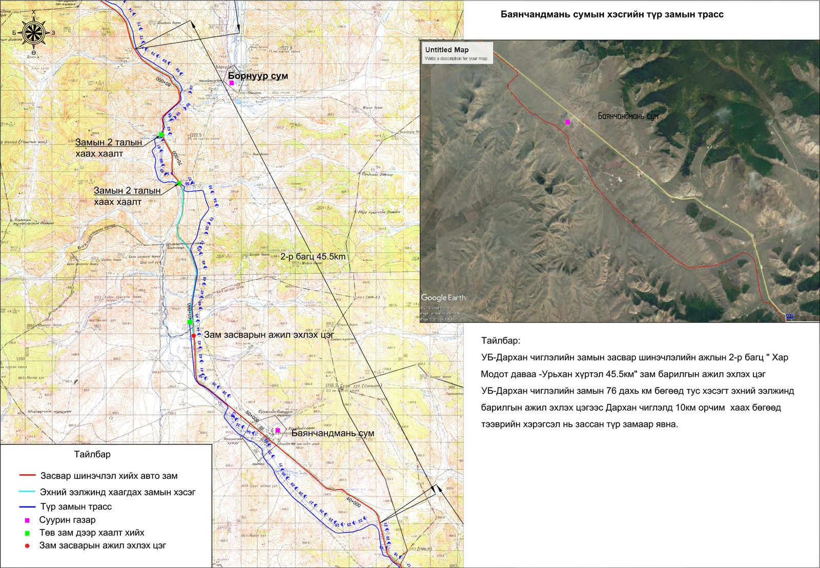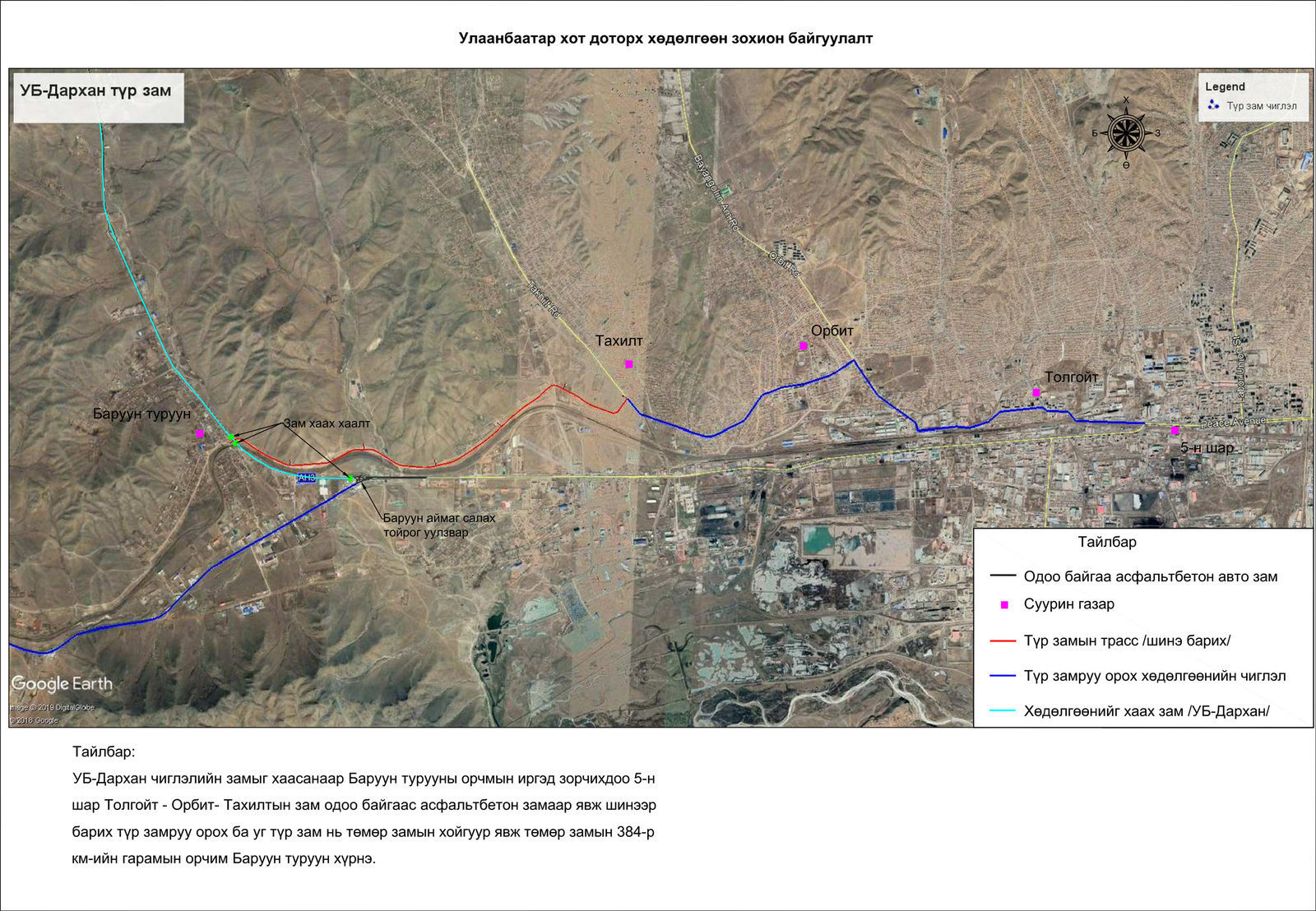 Улаанбаатар хот доторх буюу Баруунтуруун орчмын иргэд Таван шар-Толгойт-Орбит-Тахилтын замаар явж шинээр баригдсан түр зам руу нийлнэ. Түр зам нь төмөр замын хойгуур явж төмөр замын 384-р км-ийн гармын орчим Баруун туруунд хүрнэ.