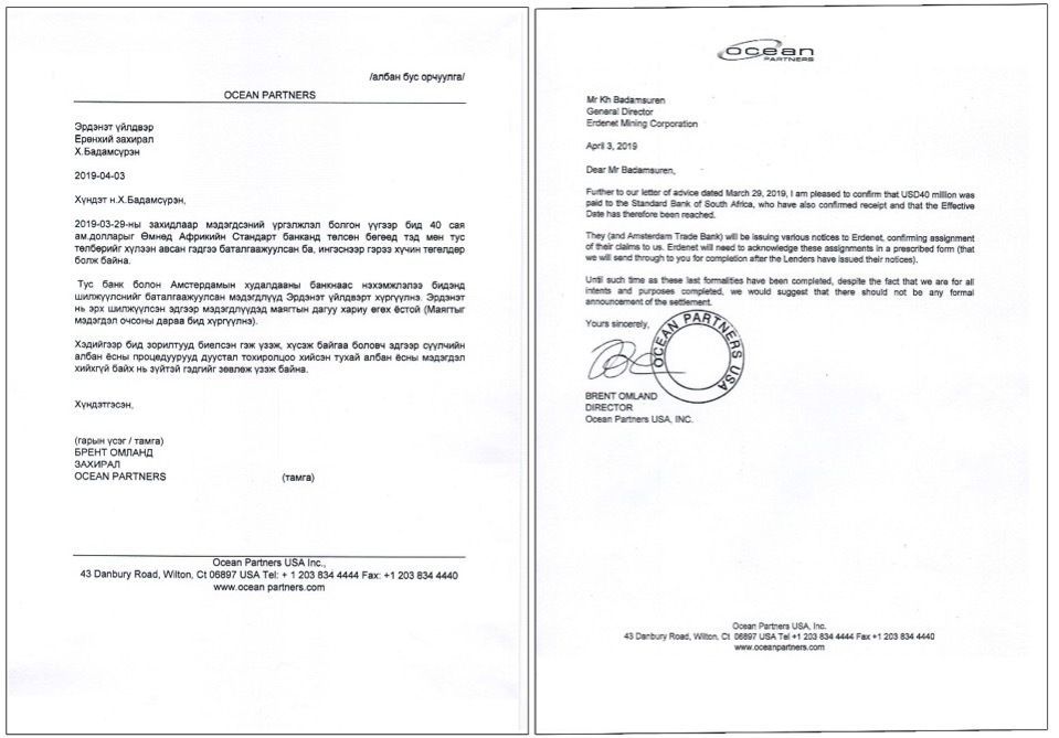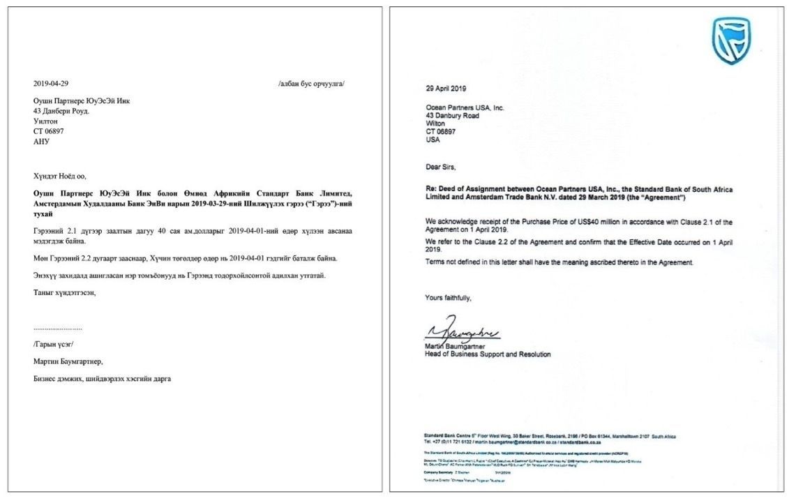 “Эрдэнэт үйлдвэр” ТӨҮГ-аас Өмнөд Африкийн Стандарт банкинд төлөх 40 сая ам долларыг 2019 оны 03 дугаар сарын 29-ний өдөр шилжүүлсэн. Стандарт банкны зүгээс 2019 оны 04 дүгээр сарын 01-ний өдөр 40 сая ам доллар хүлээж авсанаа мэдэгдсэн.
