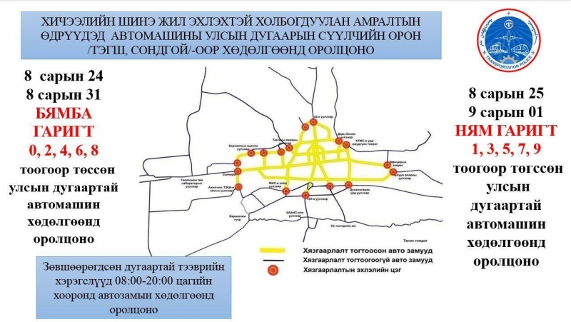 - Улсын дугаар нь СОНДГОЙ тоогоор (1, 3, 5, 7, 9) төгссөн автомашин наймдугаар сарын 25, есдүгээр сарын 01-ний ням гарагт замын хөдөлгөөнд оролцоно.