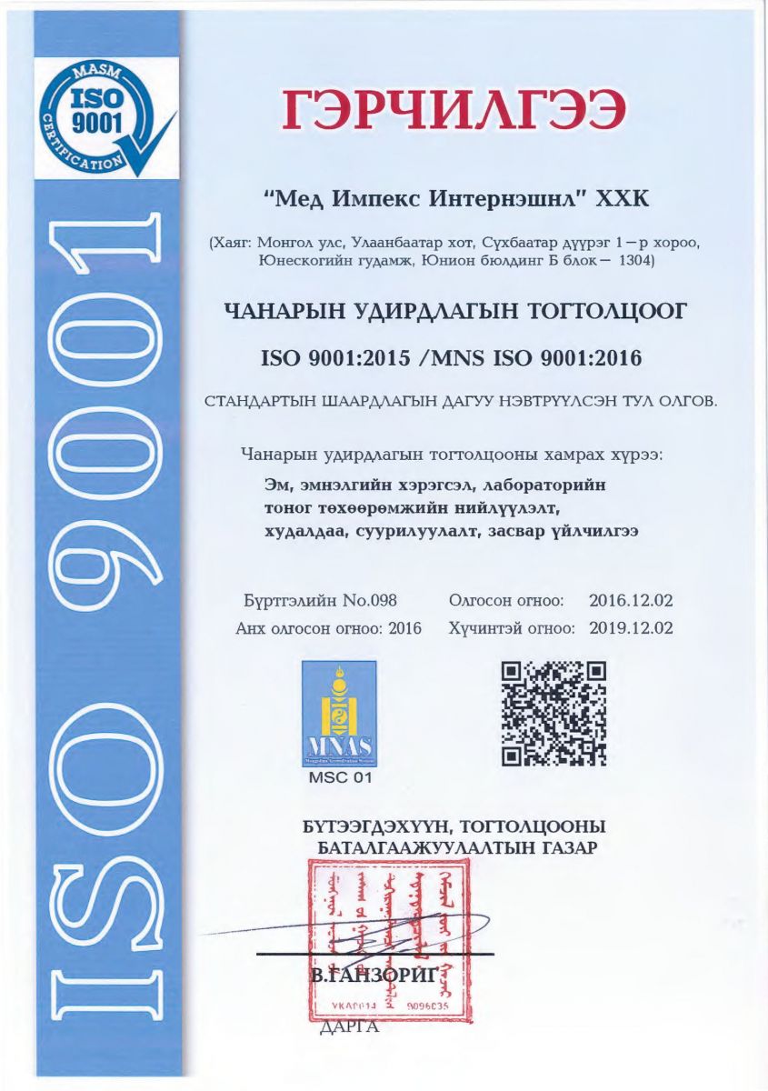 Медимпекс компанийн хамт олон өөрсдийн эрхэлж буй бизнесийн үйл ажиллагаагаа олон улсын түвшинд мөрддөг хэм хэмжээнд хүргэн сайжруулах, ямагт хэрэглэгчдийн сэтгэл ханамжийг дээдлэн ажиллах үүднээс Олон улсын Чанарын удирдлагын тогтолцоо ISO 9001:2015 стандартыг нэвтрүүлэх ажлыг сүүлийн гурван жилийн турш амжилттай хэрэгжүүлсний үр дүнд 2016 оны 12 дугаар сард “Чанарын удирдлагын тогтолцоо” нэвтрүүлэн, хэрэгжүүлсэн Батламжийг гардан авлаа.