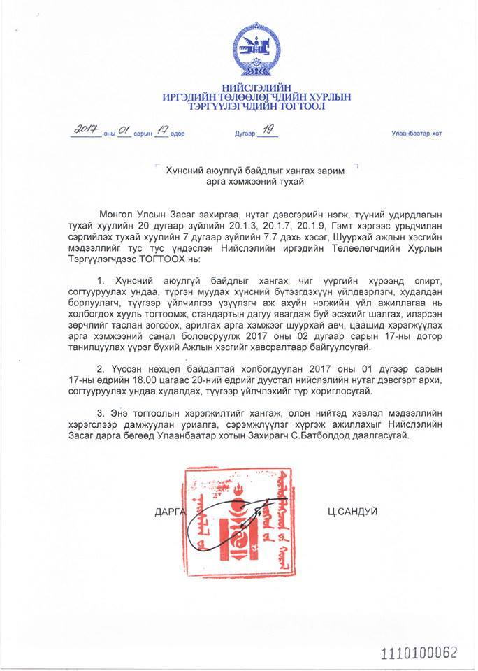 Баянгол дүүргийн хоёрдугаар хороонд өчигдөр нэр бүхий иргэд хордсон байж болзошгүйгээр амь насаа алдсан. Нийслэлийн Засаг даргын зөвлөлөөс яаралтай арга хэмжээ авч ажлын хэсэг байгуулан өнөөдөр шуурхай мэдээлэл өглөө. Амь насаа алдсан хүмүүс шингэн зүйлээс хордсон байгаа нь урьдчилсан байдлаар тогтоогдсон байна. Нийслэлийн Засаг даргын зөвлөл өргөтгөсөн байдлаар хуралджээ. Үүссэн нөхцөл байдалтай холбогдуулан НИТХ-ын Тэргүүлэгчдийн тогтоолоор өнөөдрийн 18:00 цагаас эхлэн энэ сарын 20-ны өдрийг дуустал нийслэлийн нутаг дэвсгэрт архи, согтууруулах ундаа худалдаалах түүгээр үйлчлэхийг хориглосон байна.