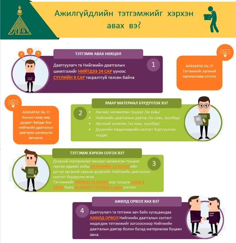 Та нийгмийн даатгалын шимтгэлээ 24 сараас доошгүй, тэр дундаа сүүлийн есөн сард нь тасралтгүй төлсөн нөхцөлд ажлаасаа гарвал ажилгүйдлийн тэтгэмж авах эрхтэй. Ажилгүйдлийн тэтгэмжийг оршин суугаа газрынхаа Хөдөлмөр, халамжийн үйлчилгээний хэлтэс эсвэл нийгмийн даатгалын байгууллагад бүртгүүлсэн өдрөөс эхлэн ажлын 76 өдөр дуустал хугацаанд олгодог. Иргэд бүртгүүлэхдээ ажилгүйдлийн тэтгэмж авах өргөдөл, нийгмийн даатгалын дэвтэр, ажлаас чөлөөлөгдсөн тухай тушаал, шийдвэрээ авч очно.