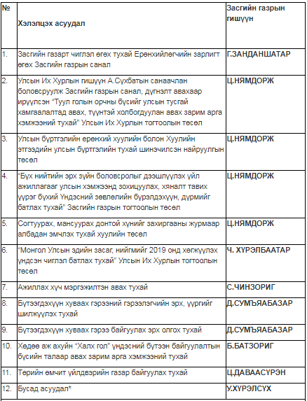 Тодруулбал, согтуурах, мансуурах донтой хүнийг захиргааны журмаар албадан эмчлэх тухай хуулийн төсөл, төрийн өмчит үйлдвэрийн газрыг байгуулах тухай, Засгийн газарт чиглэл өгөх тухай Ерөнхийлөгчийн зарлигт өгөх зэрэг асуудлыг хэлэлцэх юм байна. Мөн Засгийн газрын Хэвлэл мэдээллийн албанаас "Гадаадад суугаа зарим Элчин сайдын асуудлыг хэлэлцэнэ" хэмээн мэдээллээ. Засгийн газар цаашдаа тогтмол 08.00 цагаас хуралдаж байхаар болжээ. Одоогийн байдлаар эхний хэдэн асуудлаа хэлэлцэн шийдвэрлэсэн бөгөөд А.Сүхбат гишүүний санаачлан боловсруулсан Туул голыг тусгай хамгаалалтанд авах тогтоолын төслийг дэмжээд байгаа юм байна.