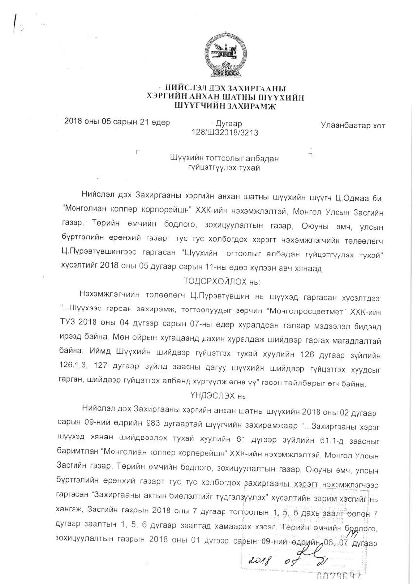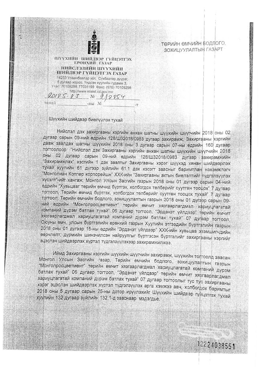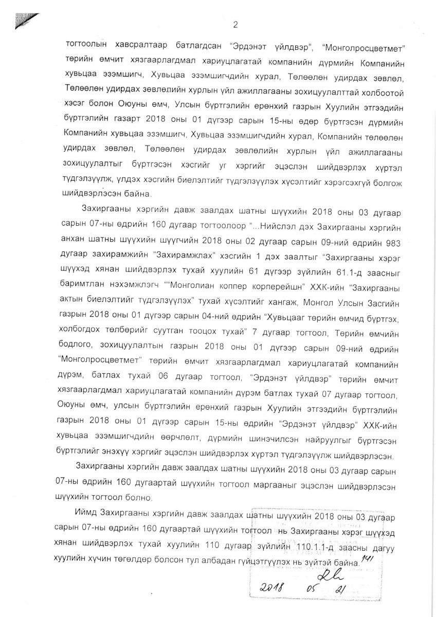 “Эрдэнэт үйлдвэр” ХХК-ийн ТУЗ-ийг төрөөс 100 хувь томилсон болон 49 хувийн хувьцааг төрд шилжүүлсэн Засгийн газрын 2018 оны 01 дүгээр сарын 04-ний өдрийн 07 дугаар тогтоол, түүнийг дагаж хийгдсэн хувьцааны өөрчлөлтийн бүртгэл зэргийг Нийслэл дэх Захиргааны хэргийн анхан шатны шүүх, Захиргааны хэргийн Давж заалдах шатны шүүхээс 2018 оны 03 дугаар сарын 07-ны өдөр түдгэлзүүлсэн. Түүнчлэн Нийслэл дэх Захиргааны хэргийн анхан шатны шүүхийн 2018 оны 04 дүгээр сарын 30-ны өдрийн хурлаар дээрх Засгийн газрын тогтоол, хувьцааны өөрчлөлтийн бүртгэл зэрэг 10 захиргааны актыг илт хууль бус болохыг тогтоож, хүчингүй болгосон.
