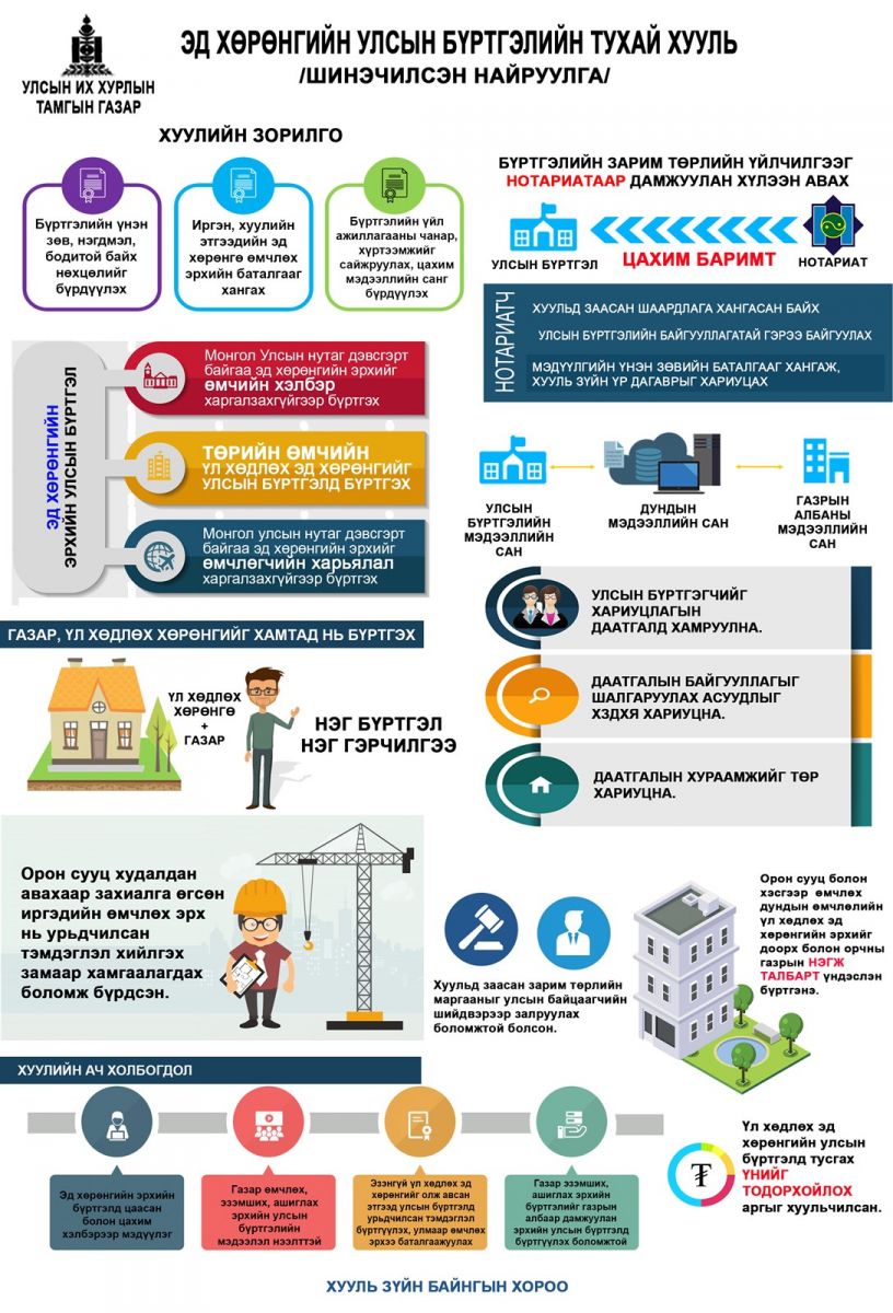 Иргэний хуультай нийцүүлэн эд хөрөнгийн эрхийн улсын бүртгэлд бүртгүүлснээр үл хөдлөх эд хөрөнгө өмчлөх болон түүнтэй холбоотой бусад эрх үүсэхээр хуульчилж, улсын бүртгэлийн байгууллага өмчлөх эрхийг бүртгэлд бүртгэснийг нотолж, гэрчилгээ олгохоор тусгалаа.