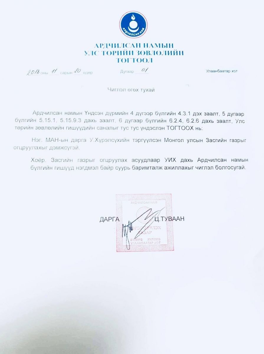 Намын дүрмийн дагуу Улстөрийн зөвлөлийн шийдвэрийг намын бүлэг биелүүлэх үүрэгтэй юм.