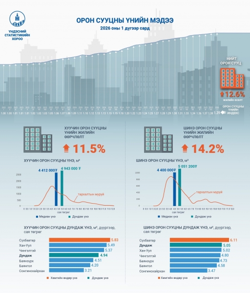 Тухайлбал, 2026 оны нэгдүгээр сарын байдлаар Сүхбаатар дүүрэг орон сууцны үнэ хамгийн өндөр буюу нэг мкв нь 6 сая 100 орчим мянган төгрөг байна. Энэ он гарсаар шинэ орон сууцны үнэ Баянзүрх дүүрэгт 18 хувиар буюу мкв нь 730 орчим мянган төгрөгөөр өссөн бол Сонгинохайрхан дүүрэгт 0.7 хувиар өсчээ. Тэгвэл хуучин орон сууцны үнэ мөн өссөн хэвээр байна. Тодруулбал, 2026 оны нэгдүгээр сард хуучин орон сууцны нэг метр квадрат талбайн дундаж үнэ 4.900,000 төгрөгийн үнэтэй байна. Байршлаар нь харвал, Сүхбаатар дүүрэгт хамгийн өндөр буюу 5.83 сая төгрөгийн үнэтэй байгаа ажээ. 2026 он гарсаар хуучин орон сууцны дундаж үнэ өмнөх оны мөн үетэй харьцуулахад Хан–Уул дүүрэгт 16.5 хувиар буюу нэг метр квадрат талбайн дундаж үнэ 780 орчим мянган төгрөг өсжээ.