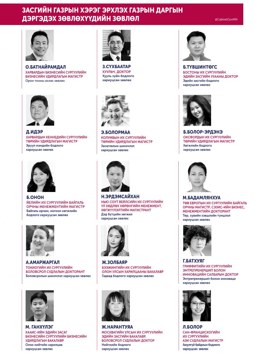 - Н.ЭРДЭМСАЙХАН – Дэд бүтцийн хөгжил хариуцсан зөвлөх /НЬЮ СОУТ ВЕЙЛСИЙН ИХ СУРГУУЛИЙН ҮЛ ХӨДЛӨХ ХӨРӨНГИЙН МЕНЕЖМЕНТ, ХӨГЖҮҮЛЭЛТИЙН МАГИСТР/