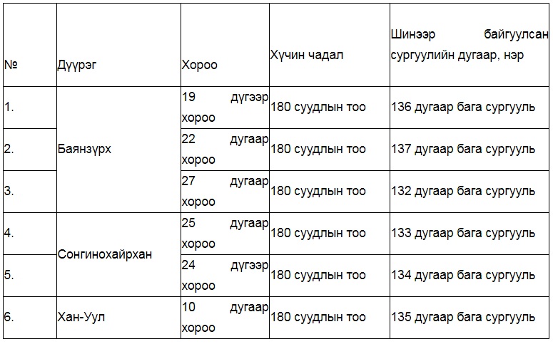 ШИНЭЭР БАЙГУУЛАХ БАГА СУРГУУЛИЙН ЖАГСААЛТ