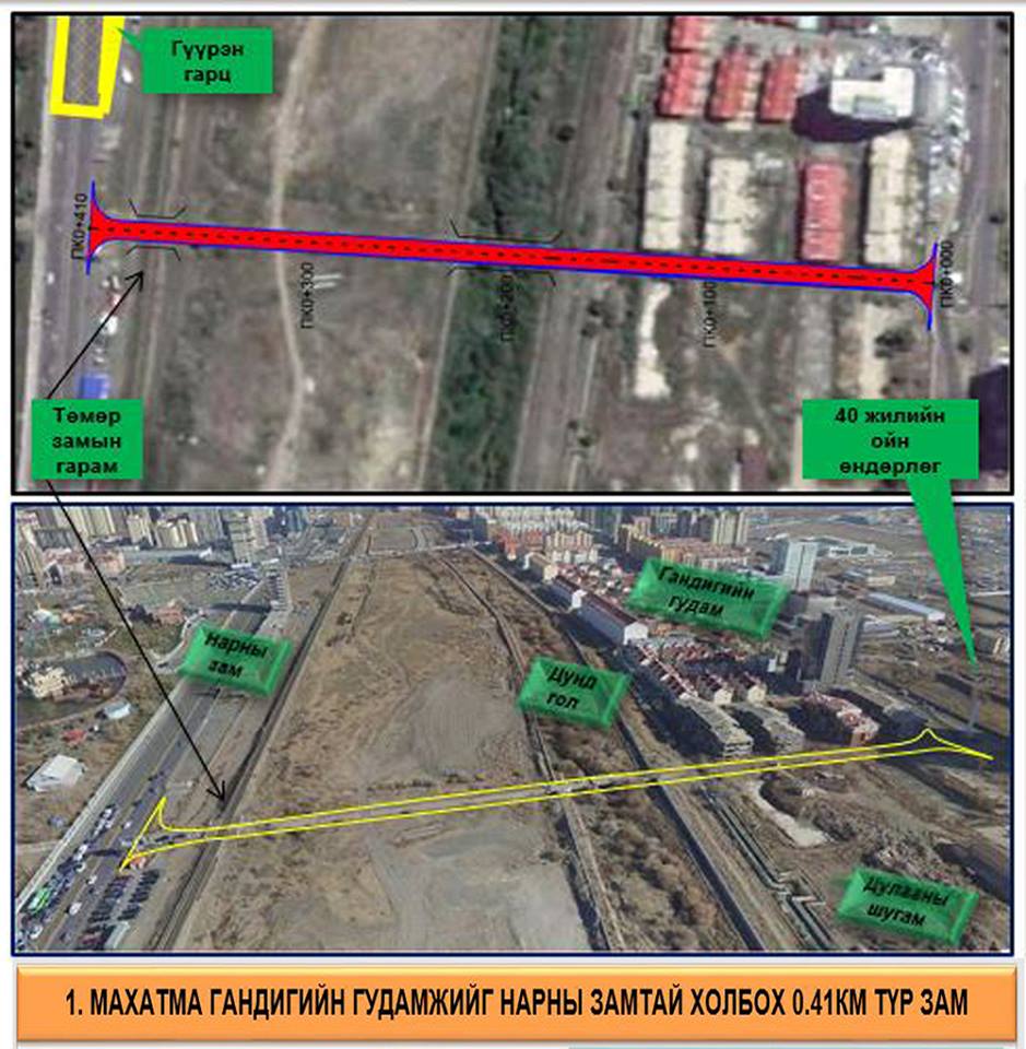 1.Махатма Гандигийн гудамжийг нарны замтай холбох 0.41км түр зам