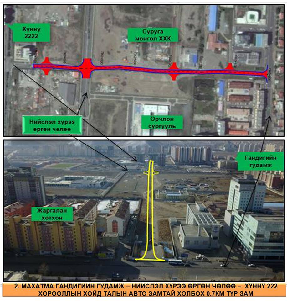 2. Махатма Гандигийн гудамж-нийслэл хүрээ өргөн чөлөө-Хүннү 222 хорооллын хойд талын авто замтай холбох 0.7км түр зам
