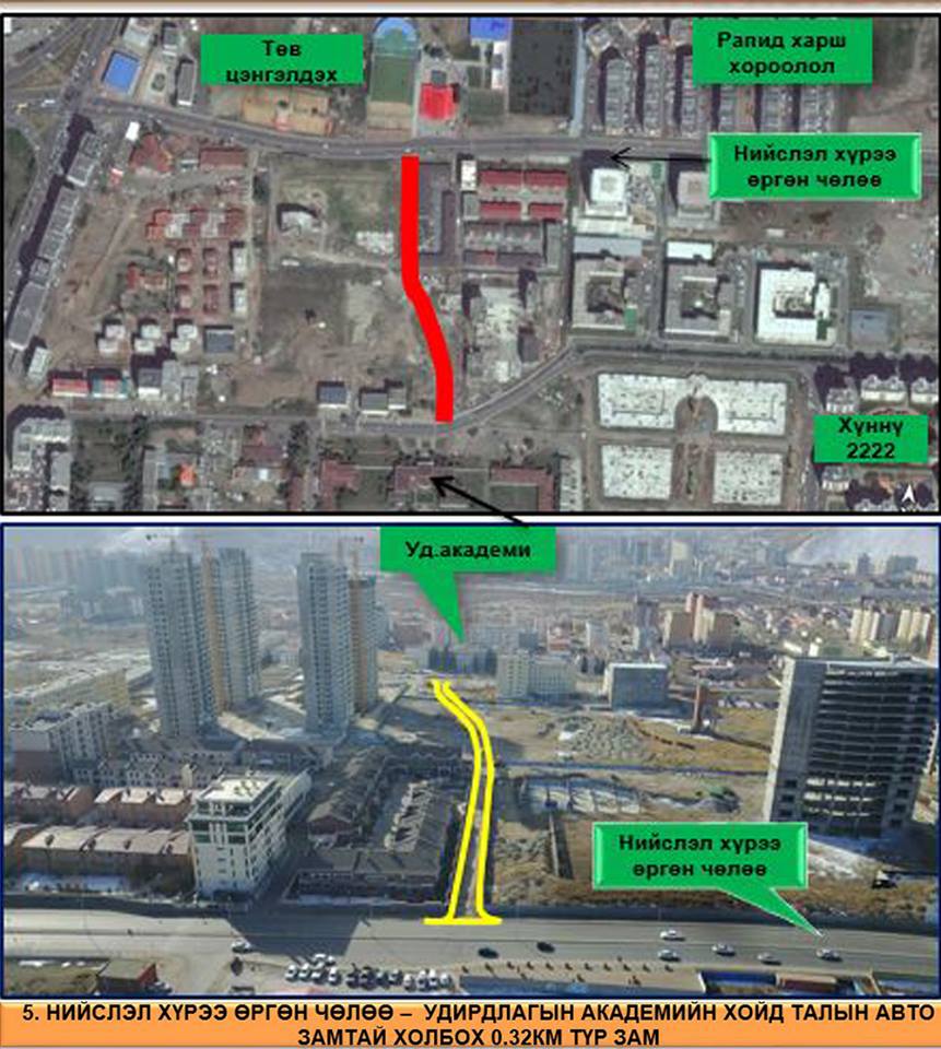 5.Нийслэл хүрээ өргөн чөлөө-Удирдлагын академийн хойд талын авто замтай холбох 0.32км түр зам