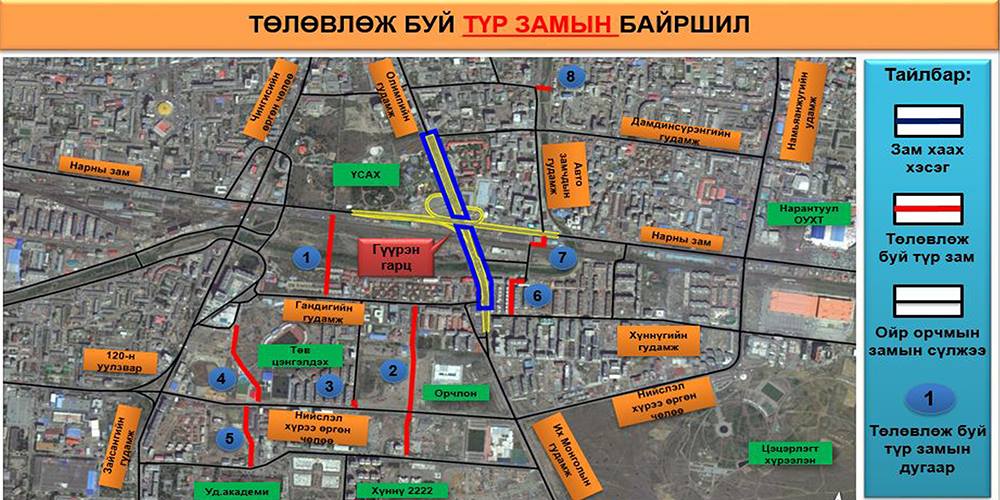 “Замын цагдаагийн газрын ойролцоо гүүрэн гарц барих төсөл”-ийн ажилтай холбогдуулан дараах 7 түр замыг гаргаж байгаа аж.